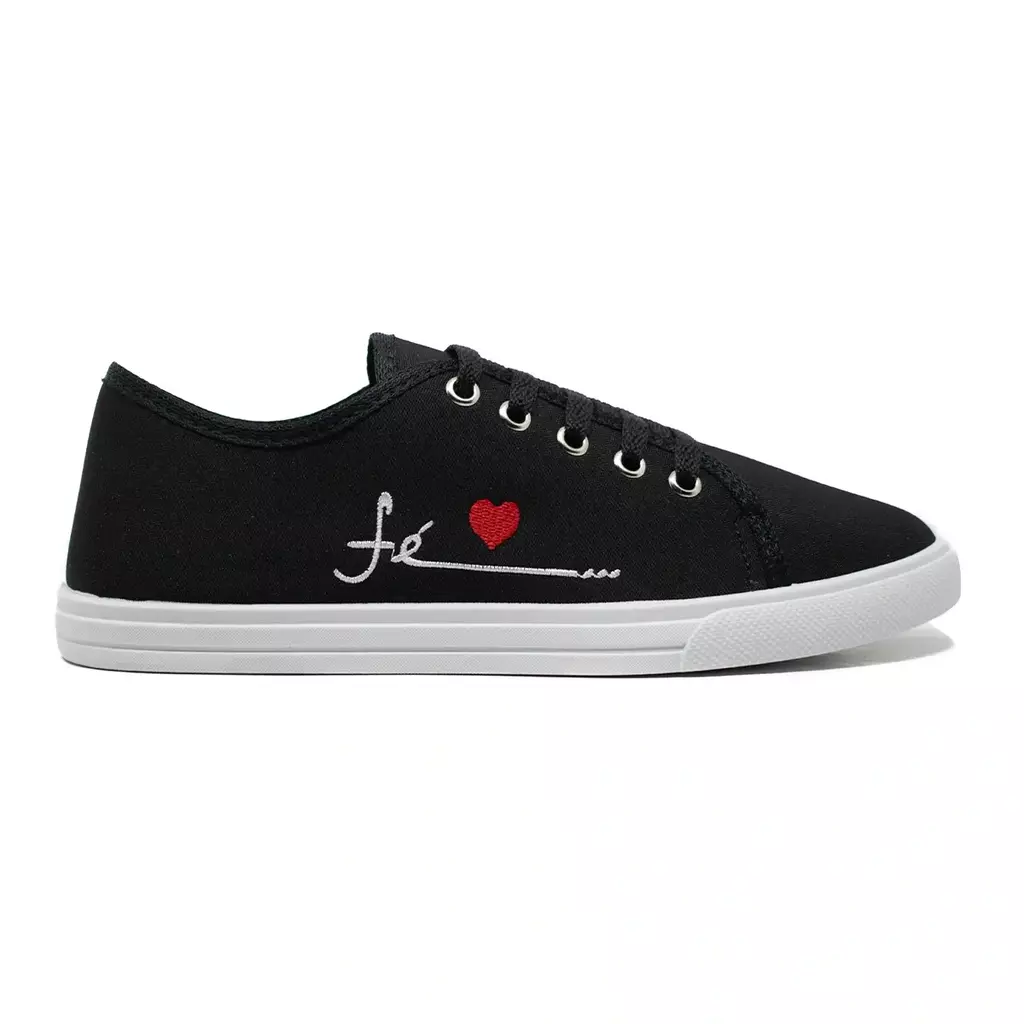 Com bordado delicado da palavra “Fé” e um coração vermelho, ele une moda, conforto e significado, feito em material têxtil leve e macio, proporciona uma pisada suave e ideal para o dia a dia.