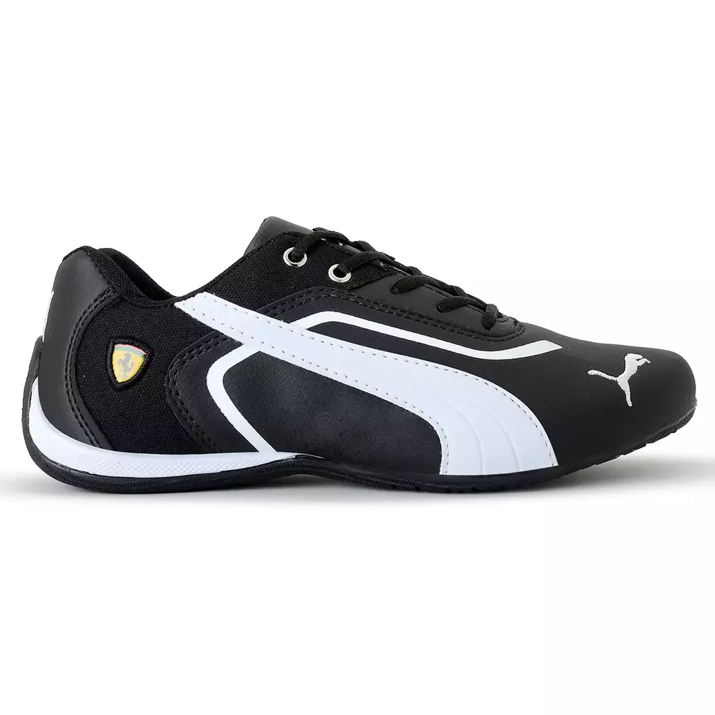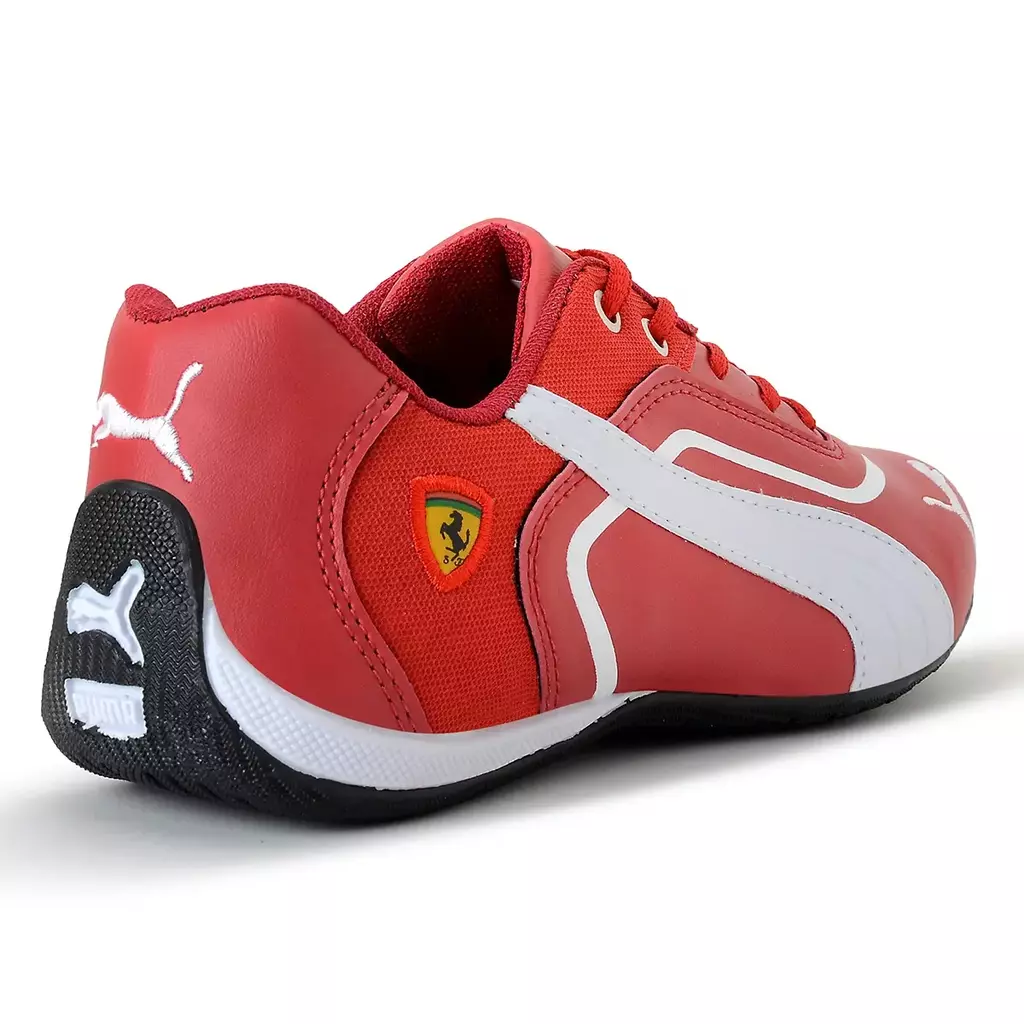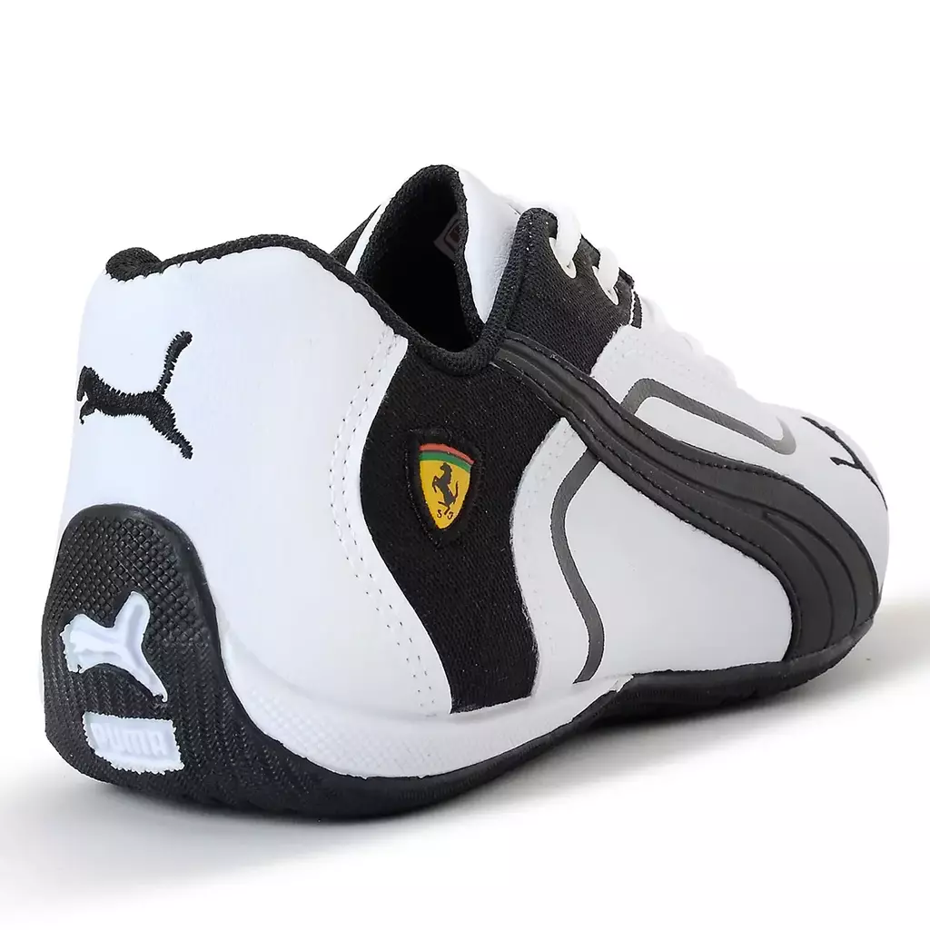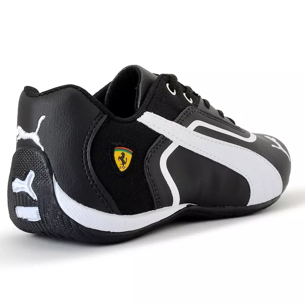 O cabedal conta com detalhes sutis que remetem ao estilo automobilístico, incluindo o icônico logo da Ferrari na lateral, o que reforça a parceria entre a Puma e a famosa escuderia de Fórmula 1., sua sola oferece excelente aderência e tração, garantindo estabilidade em diversos tipos de superfícies.
